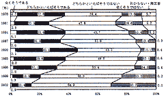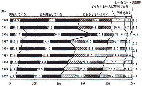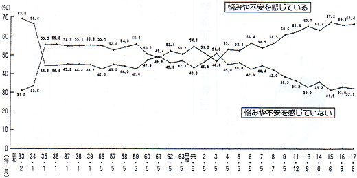 中越地震から1年以上が過ぎました。皆様、お元気で過ごしていらっしゃいますか。 内閣府によって1978年から実施されている「国民の意識とニーズ」についての時系列調査での直近の結果は、「国民の生活全般に関する満足度」は調査開始以来の低下傾向が進み、過去最低の41.3%となっています。また、「世の中は次第に暮らしよい方向に向かっている」と考える人の割合も調査開始以来最低の14.3%の低水準を記録しています。さらに、同じく内閣府が毎年行っている「国民生活に関する世論調査」2005年度版によると、国民の66.4%が日常生活に悩みや不安を感じていると答えていますし、「物の豊かさ」と「心の豊かさ」どちらを重視したいかという問いに対しては、物の豊かさが28.4%、心の豊かさが57.8%、どちらともいえないが11.7%となっていて、物の豊かさと心の豊かさの差は年々広がる傾向です。